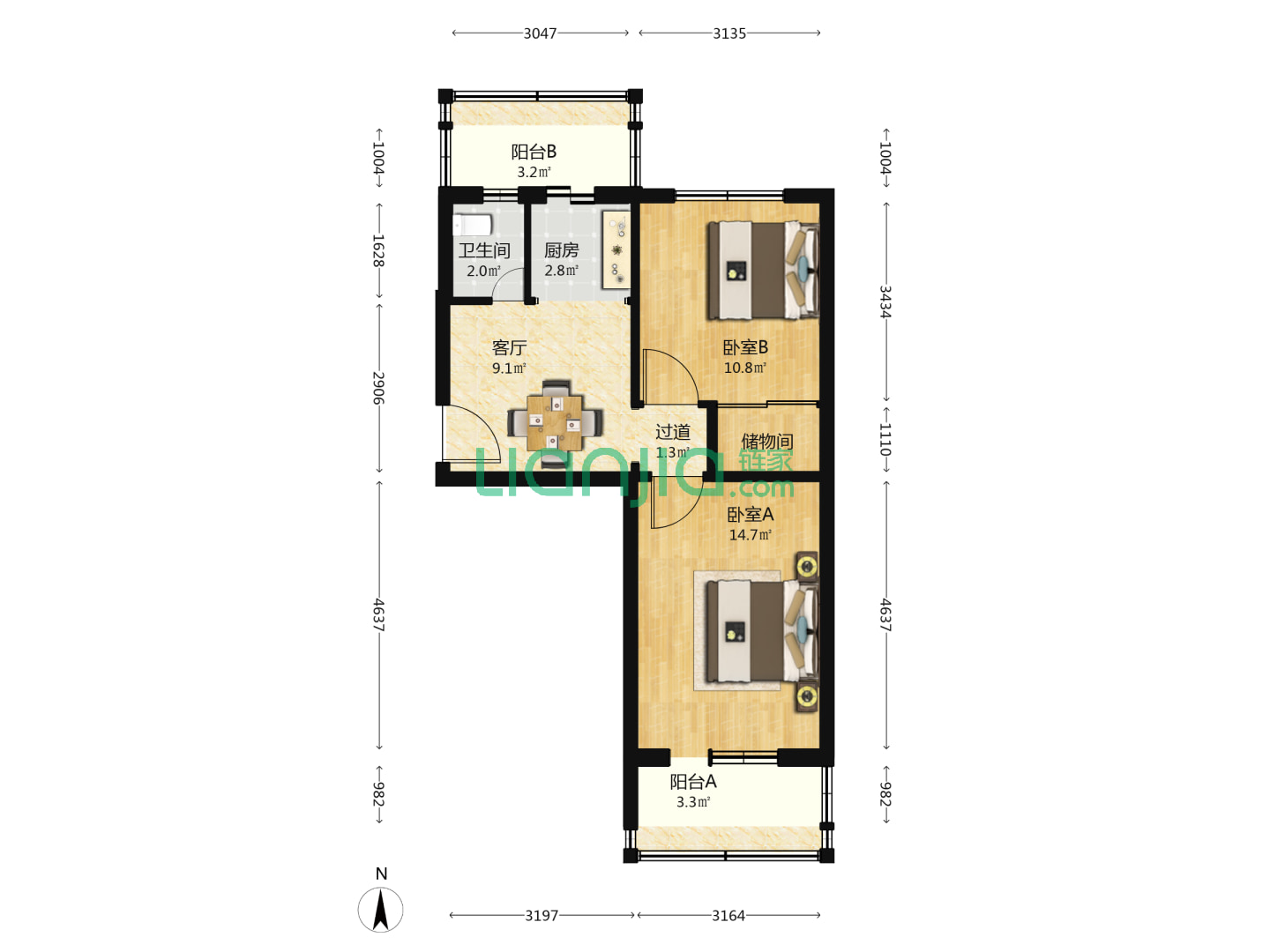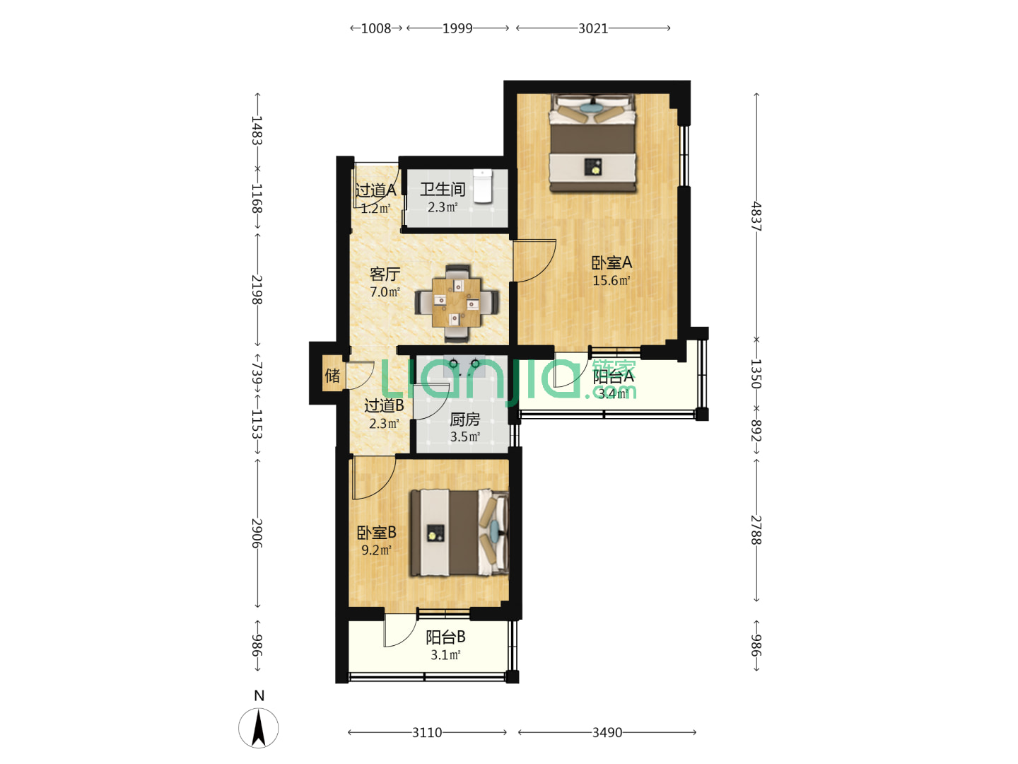 2室2厅2卫 62㎡